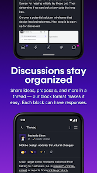 يهدف هذا التطبيق إلى توفير حلاً وسطًا للفرق في التواصل، مما يتيح لهم الاستفادة من فوائد الدردشة مع التحول نحو ثقافة أكثر غير متزامنة ومكتوبة. يستلهم التطبيق من تويتر، مشجعًا على تحديثات ومحادثات موجزة وسهلة الفهم، مع تقليل الرسائل الكثيرة المرهقة. من خلال تقسيم الأفكار الطويلة إلى كتل، يمكن للفرق الاطلاع بسرعة ومناقشة واتخاذ القرارات في وقتهم الخاص.